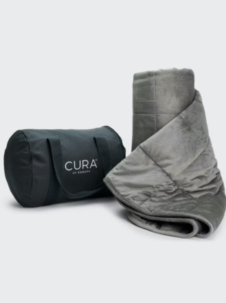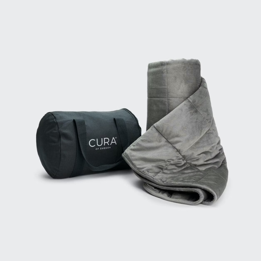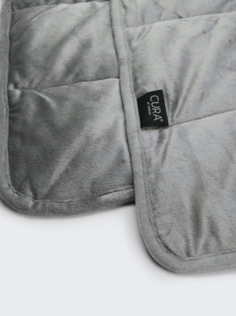 Weighted blanket background with CURA A better night. A better day. A better life.